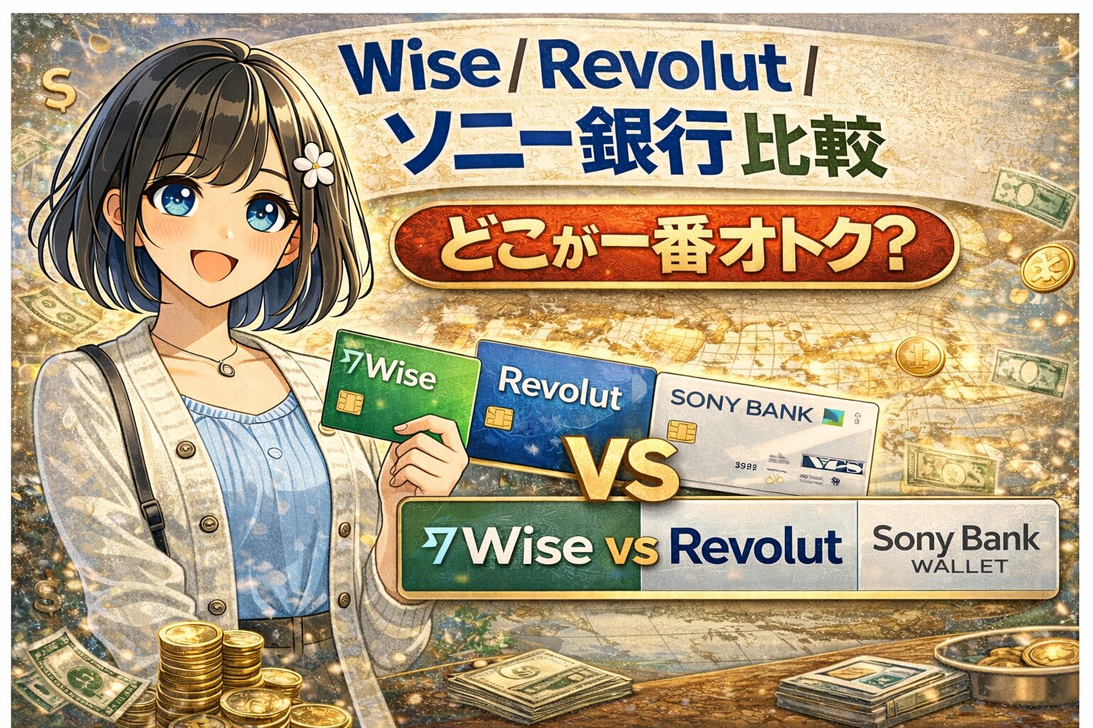 円安時代の海外旅行で「両替で損したくない」人向けに、3大決済サービスを徹底比較します。本記事は「Wise Revolut ソニー銀行 比較」で検索する人向けに、海外 為替手数料 比較・Wiseカード 使い方 ATM・Revolut 日本人 使い方・ソニー銀行 外貨 手数料・外貨両替 クレカ どっちが得まで網羅します。
